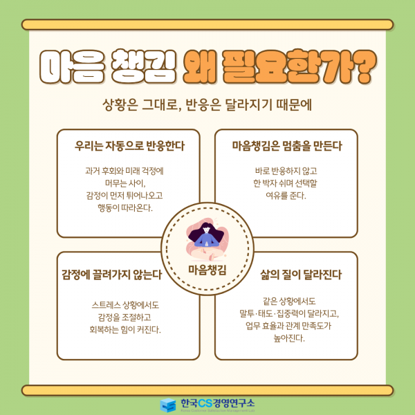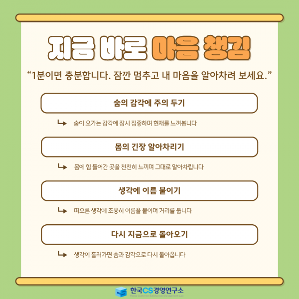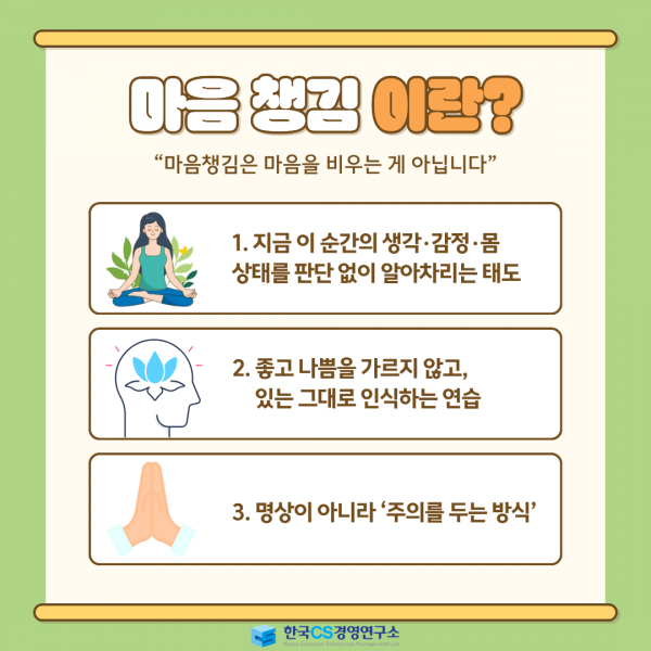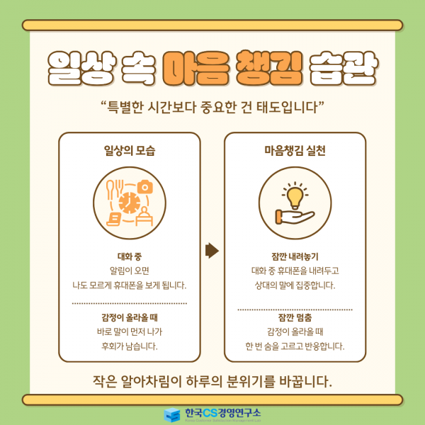 [한국CS경영연구소] 바쁘게 살수록 필요한 연습 '마음 챙김' 페이지 정보 작성자 최고관리자 작성일 26-01-05 11:25 조회 13회 댓글 0건 본문 이 순간의 나를 놓치지 않기 위한 작은 태도 '마음 챙김'작은 알아차림이 하루의 분위기와 관계의 결을 바꿉니다. 목록 댓글목록 0 댓글목록 등록된 댓글이 없습니다.