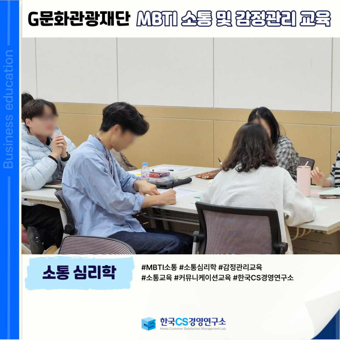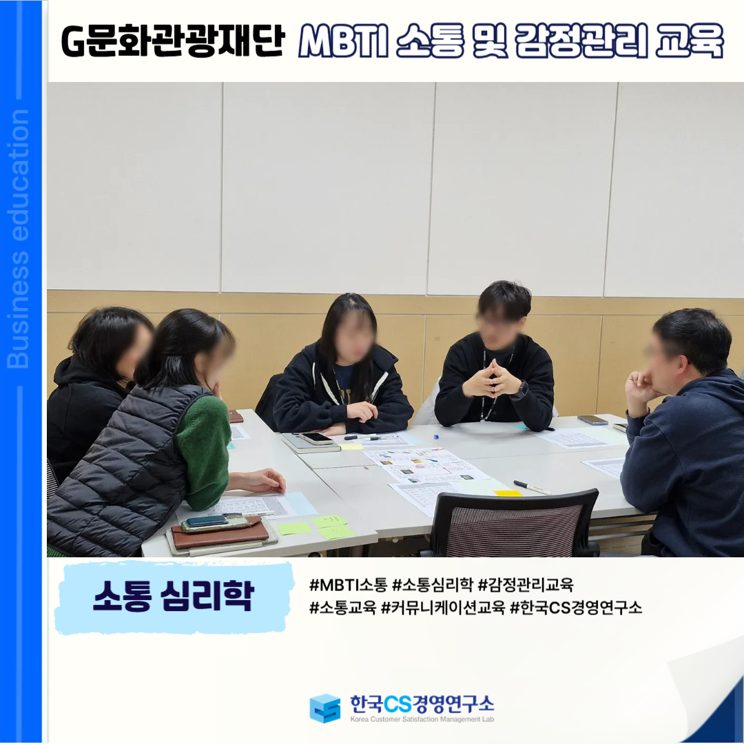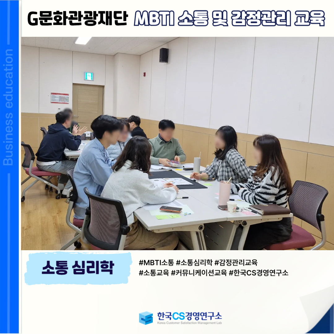 <G문화관광재단>에서 MBTI 기반의 자기·타인 이해를 통해 공감 소통 능력을 향상시키고, 감정을 효과적으로 관리할 수 있는 역량을 강화하기 위해 'MBTI 소통 및 감정관리 교육'을 진행했습니다.