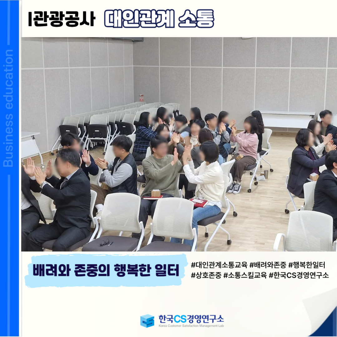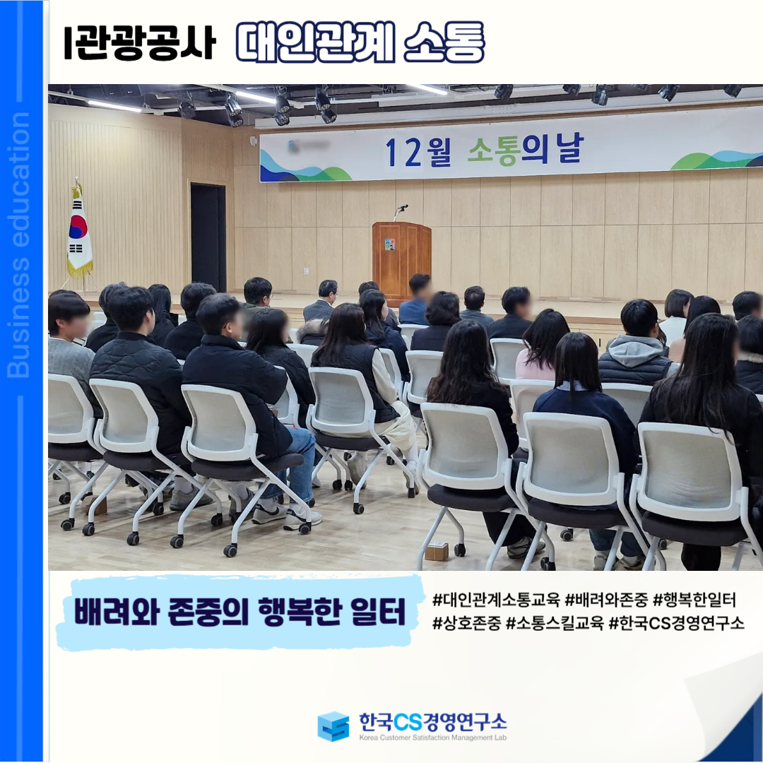 <I관광공사>에서는 배려와 존중을 바탕으로 한 행복한 일터를 만들기 위해 전 임직원을 대상으로 ‘대인관계 소통교육’을 진행했습니다.