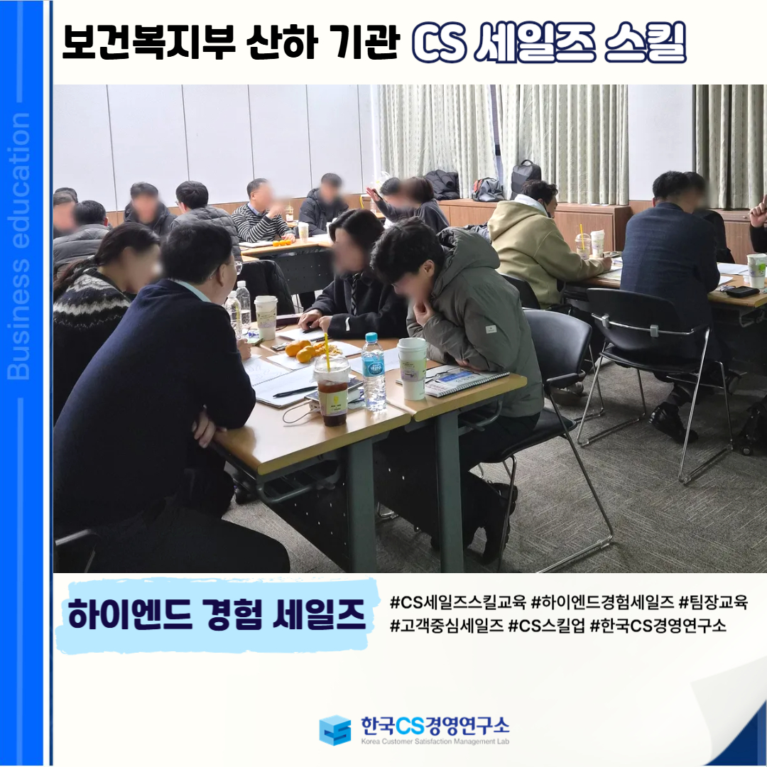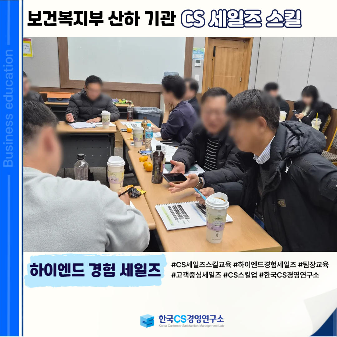 <보건복지부 산하 기관>에서 팀장 대상으로 고객 중심 사고와 신뢰 기반 커뮤니케이션 역량을 강화하여, 품질 높은 CS 세일즈 리더십을 발휘할 수 있도록 ‘CS 세일즈 스킬교육’을 진행했습니다.
