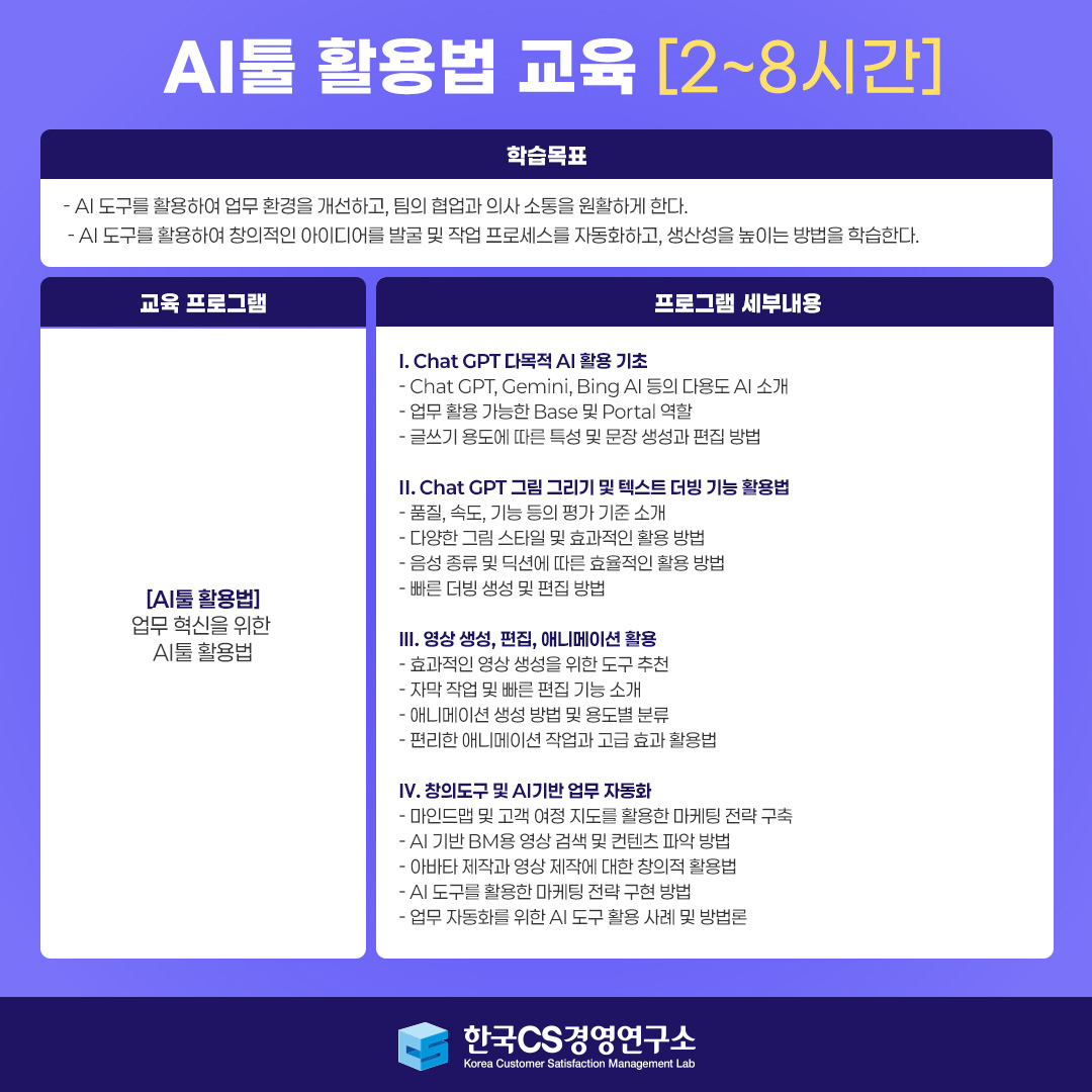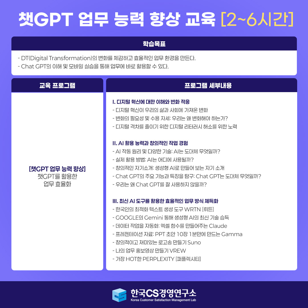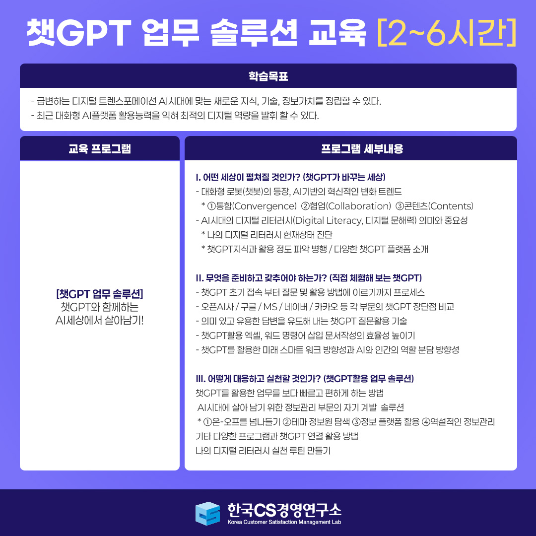 [챗GPT교육] 조직의 생산성을 높이는 'AI 실전 활용' 업무능력향상 교육_한국CS경영연구소