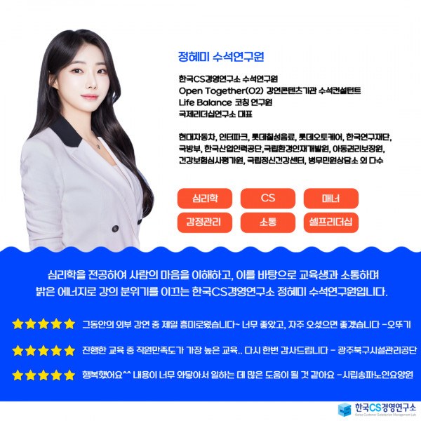 기업들의 옳은 선택이 될 수 있는 교육 가치 기반으로 기업 HRD&CS Total 분야의 대표 수행기관으로서 한국CS경영연구소는 개인과 기업의 성장에 함께하겠습니다.