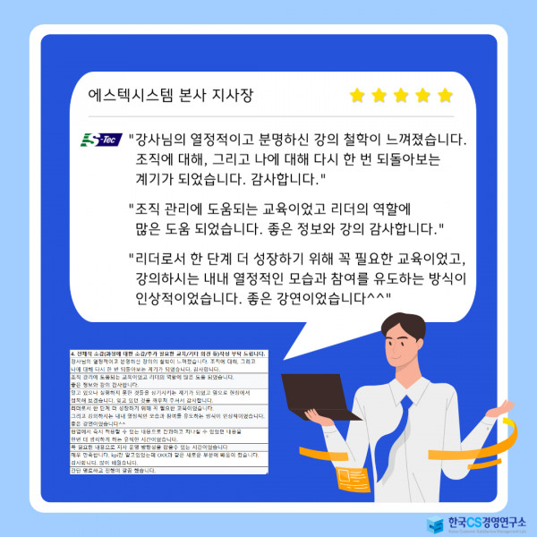 "리더로서 한 단계 더 성장하기 위해 꼭 필요한 교육이었고, 강의하시는 내내 열정적인 모습과 참여를 유도하는 방식이 인상적이었습니다. 좋은 강연이었습니다^^"