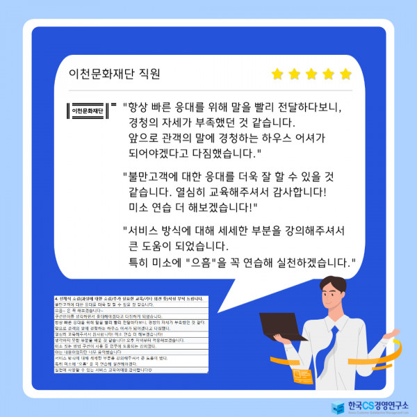 "서비스 방식에 대해 세세한 부분을 강의해주셔서 큰 도움이 되었습니다. 특히 미소에 "으흠"을 꼭 연습해 실천하겠습니다."