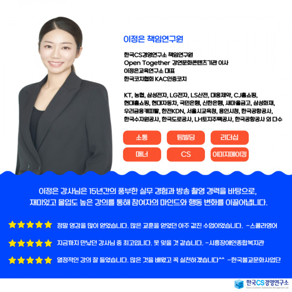 기업들의 옳은 선택이 될 수 있는 교육 가치 기반으로 기업 HRD&CS Total 분야의 대표 수행기관으로서 한국CS경영연구소는 개인과 기업의 성장에 함께하겠습니다.