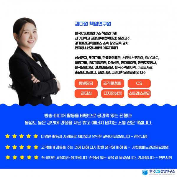 기업들의 옳은 선택이 될 수 있는 교육 가치 기반으로 기업 HRD&CS Total 분야의 대표 수행기관으로서 한국CS경영연구소는 개인과 기업의 성장에 함께하겠습니다.