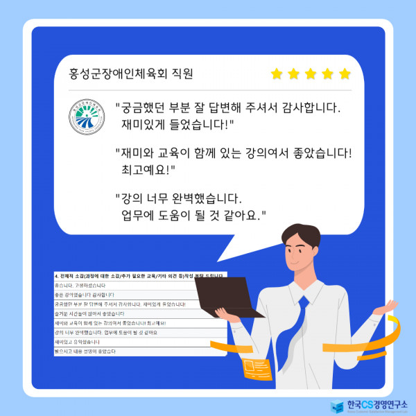홍성군장애인체육회 민원응대 현장 대응력을 높이기 위한 'CS교육'을 의뢰하셨으며, 김다원 강사님이 출강하였습니다.