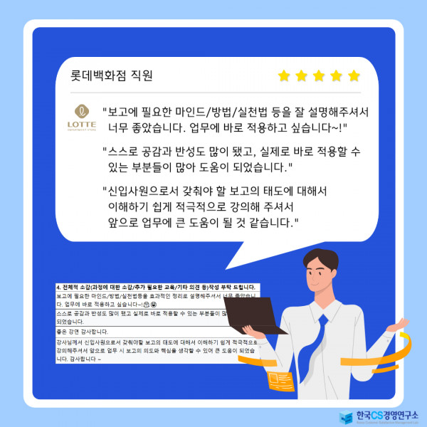 "신입사원으로서 갖춰야 할 보고의 태도에 대해서 이해하기 쉽게 적극적으로 강의해 주셔서 앞으로 업무에 큰 도움이 될 것 같습니다."