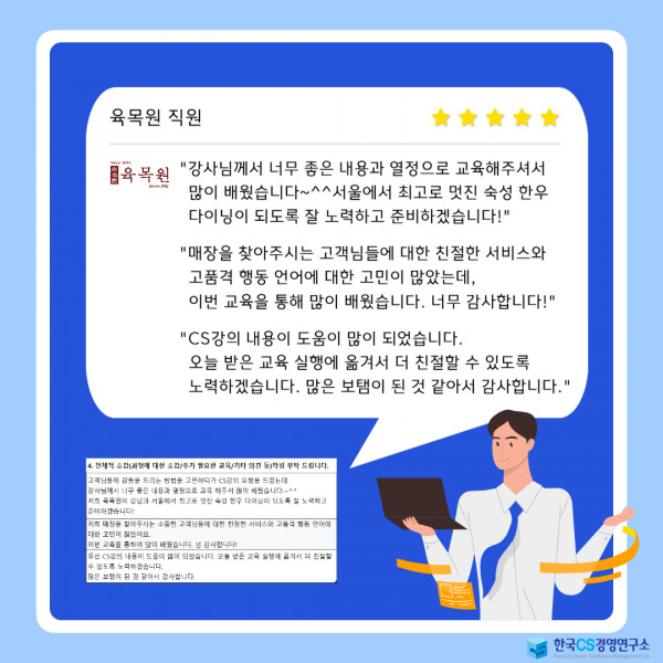 "CS강의 내용이 도움이 많이 되었습니다. 오늘 받은 교육 실행에 옮겨서 더 친절할 수 있도록 노력하겠습니다. 많은 보탬이 된 것 같아서 감사합니다."