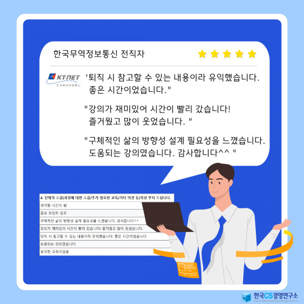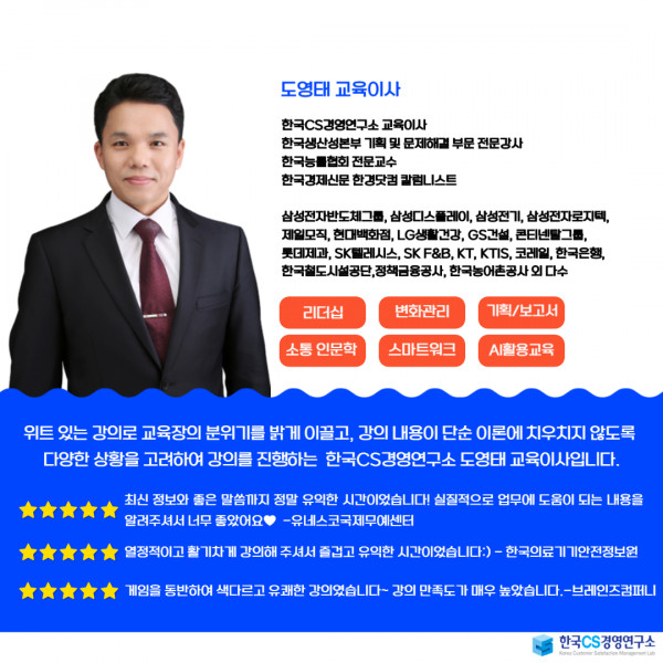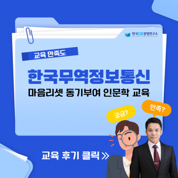 기업들의 옳은 선택이 될 수 있는 교육 가치 기반으로 기업 HRD&CS Total 분야의 대표 수행기관으로서 한국CS경영연구소는 개인과 기업의 성장에 함께하겠습니다.