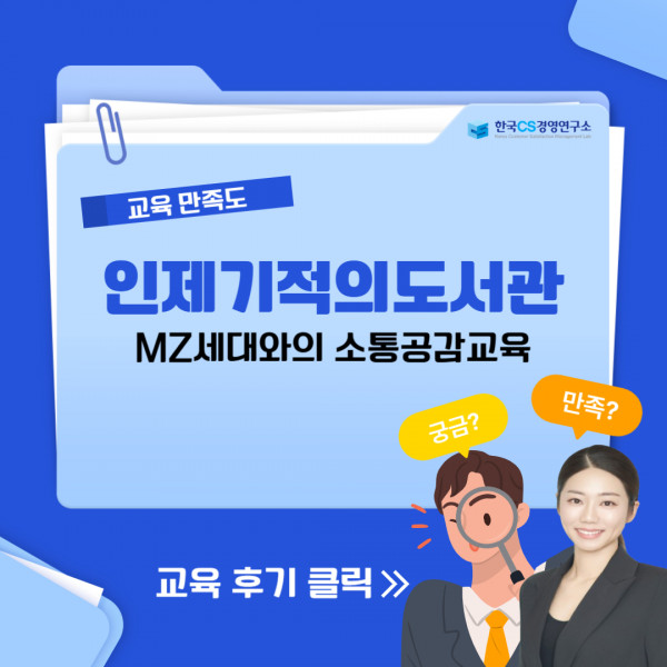 기업들의 옳은 선택이 될 수 있는 교육 가치 기반으로 기업 HRD&CS Total 분야의 대표 수행기관으로서 한국CS경영연구소는 개인과 기업의 성장에 함께하겠습니다.