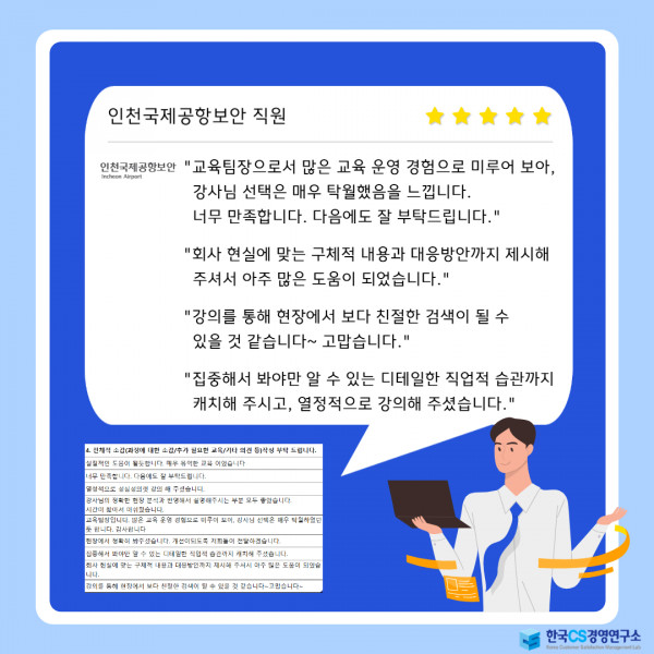 인천국제공항 직원들이 고객 중심 서비스 마인드와 전문 응대 역량을 강화하여 안전하고 신뢰받는 서비스를 제공할 수 있도록 'CS교육'을 의뢰해 주셨고, 정혜미 강사님이 출강하였습니다.