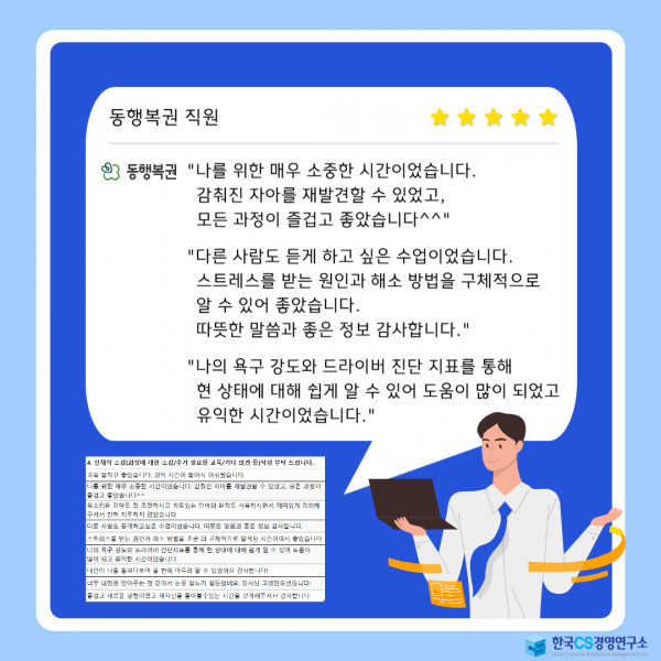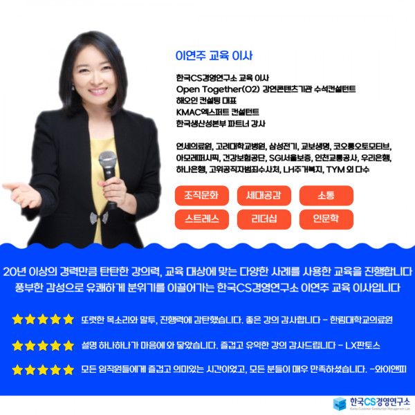 기업들의 옳은 선택이 될 수 있는 교육 가치 기반으로 기업 HRD&CS Total 분야의 대표 수행기관으로서 한국CS경영연구소는 개인과 기업의 성장에 함께하겠습니다.