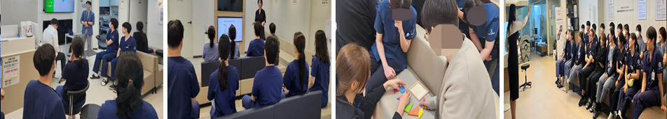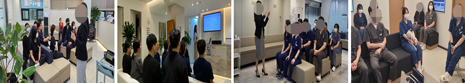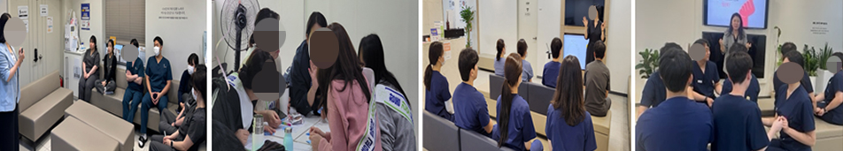 - ‘나’를 바꿀 수 있는 사람은 ‘나’ 자신밖에 없다! - TA 활용한 자주 발생하는 상황 연출 및 1:1 대인관계 및 고객 응대법 코칭 - PAC 모델의 이해와 서로 다른 직원들의 마음가짐의 태도 5가지 받아들이기 - 함께 멀리 가자! 즐거운 병원 조직문화를 위한 핵심가치 행동 실천법 공유 |